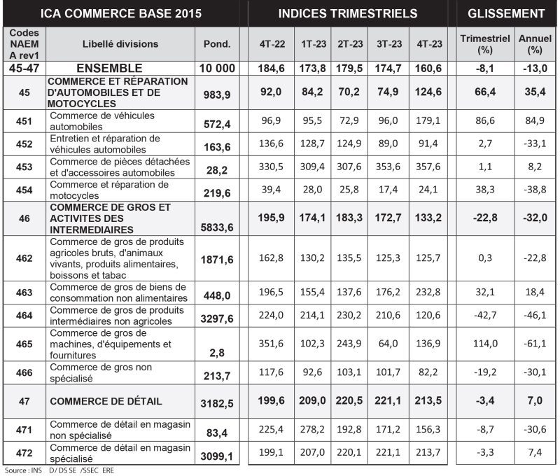 L’indice du chiffre d’affaires dans le « commerce de gros et activités des intermédiaires de gros » est en baisse de 22,8% par rapport au troisième trimestre 2023. Cela s’explique, selon l’INSD, par la baisse des fonctions « commerce de gros de produits intermédiaires non agricoles » (- 42,7%), et du « commerce de gros non spécialisé » (-19,2%). Par rapport au quatrième trimestre de l’année précédente, l’indice du chiffre d’affaires dans le « commerce de gros et activités des intermédiaires de gros » a diminué de 32%, dû essentiellement à la baisse du « commerce de gros de machines, d’équipements et fournitures » (-61,1%), du « commerce de gros de produits intermédiaires non agricoles » (-46,1%) et du « commerce de gros non spécialisé » (-30,1%).