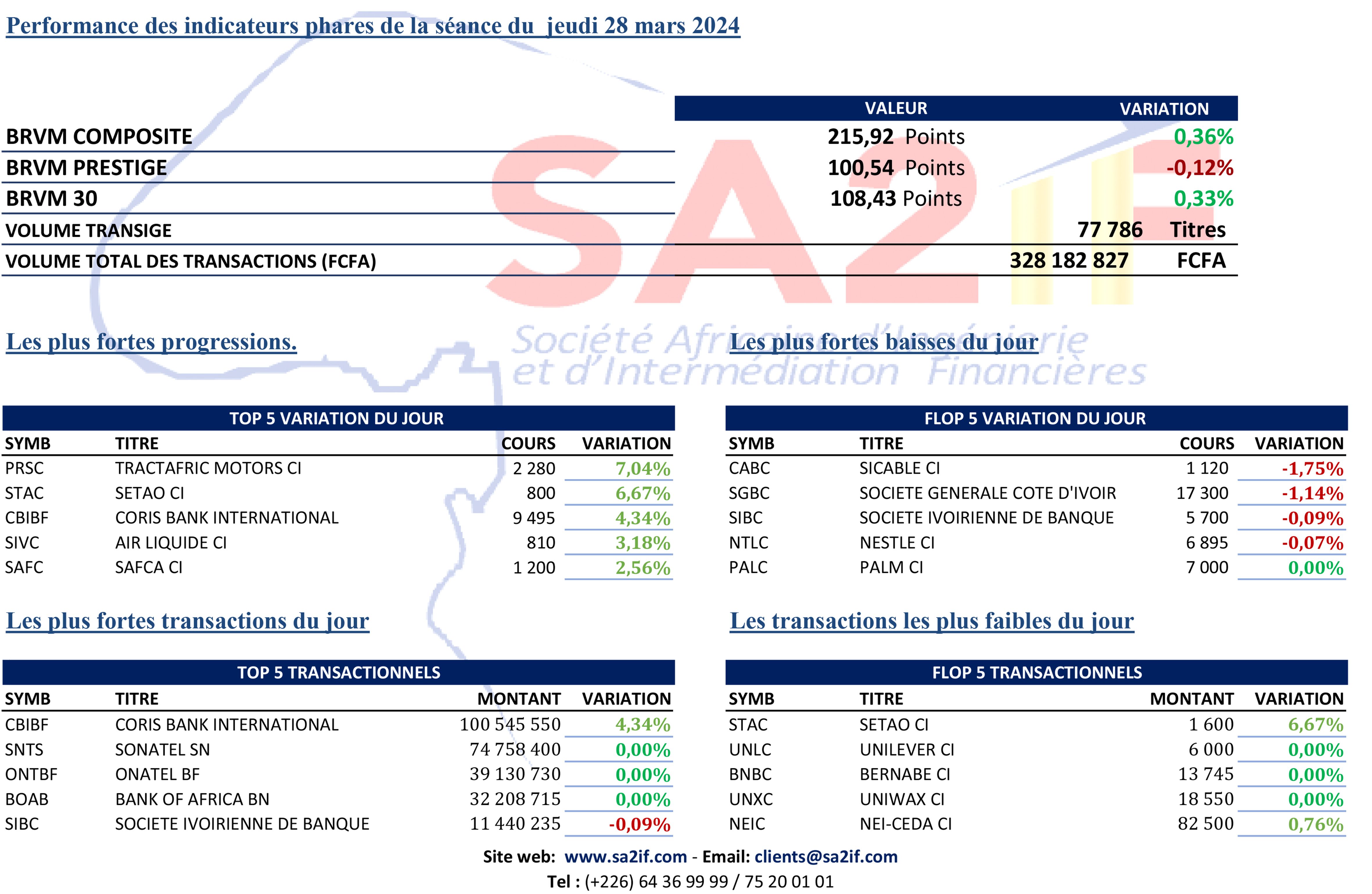 Au titres des 3 meilleures performances du jour top 3 du jour nous avons Tractafric Motors CI (+7,04%), suivie  par Setao CI (+6,67%) et Coris Bank International (+4,3%) après la publication de ses résultats financiers et du dividende distribuable.