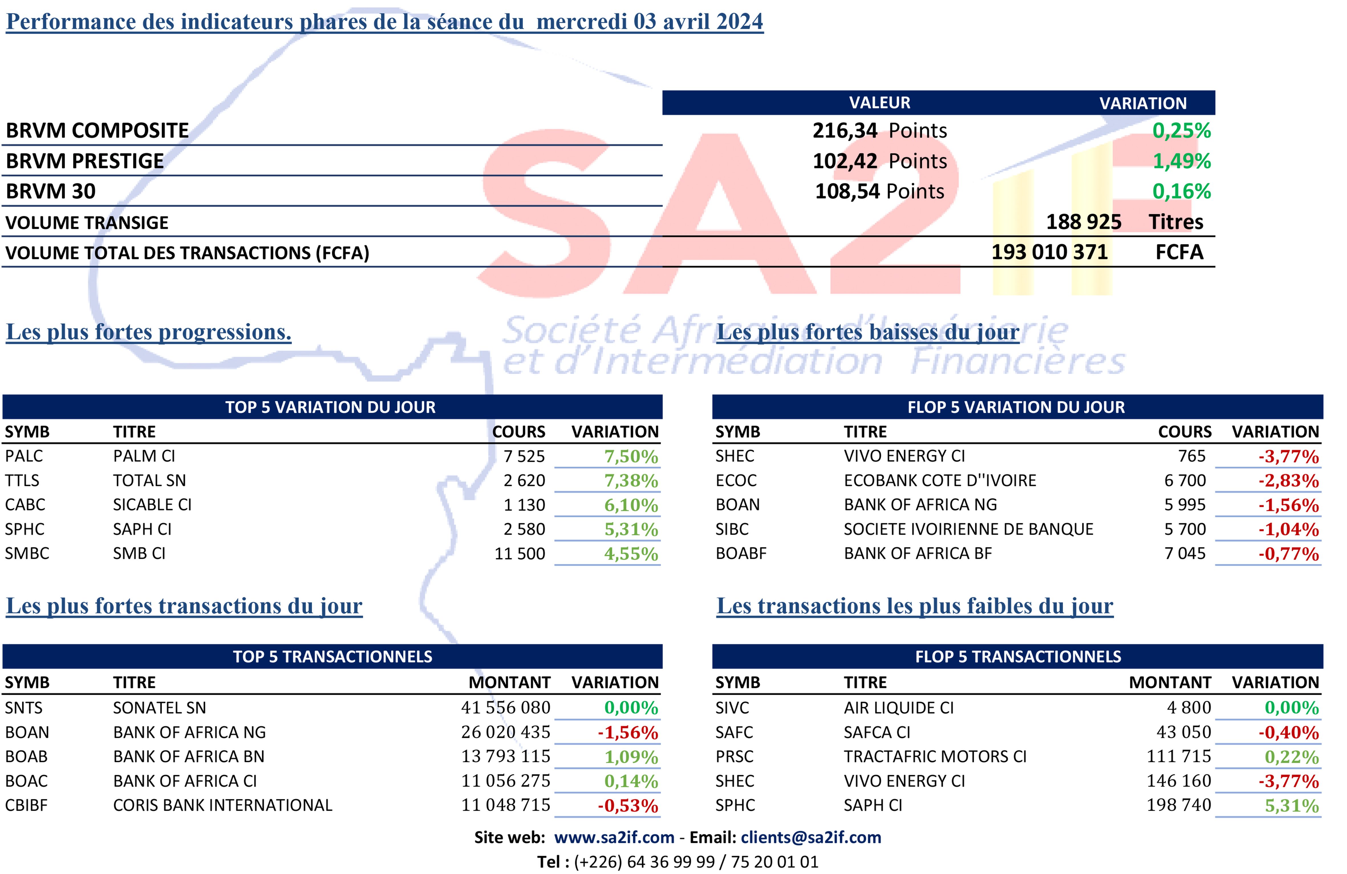 Commentaire des variations : Globalement le marché a bien performé, clôturant dans le vert sur cette séance de cotation. Cette hausse de 0,25% à 216,34 points est en partie due aux variations positives constatées sur les titres Palm CI et Orange CI.