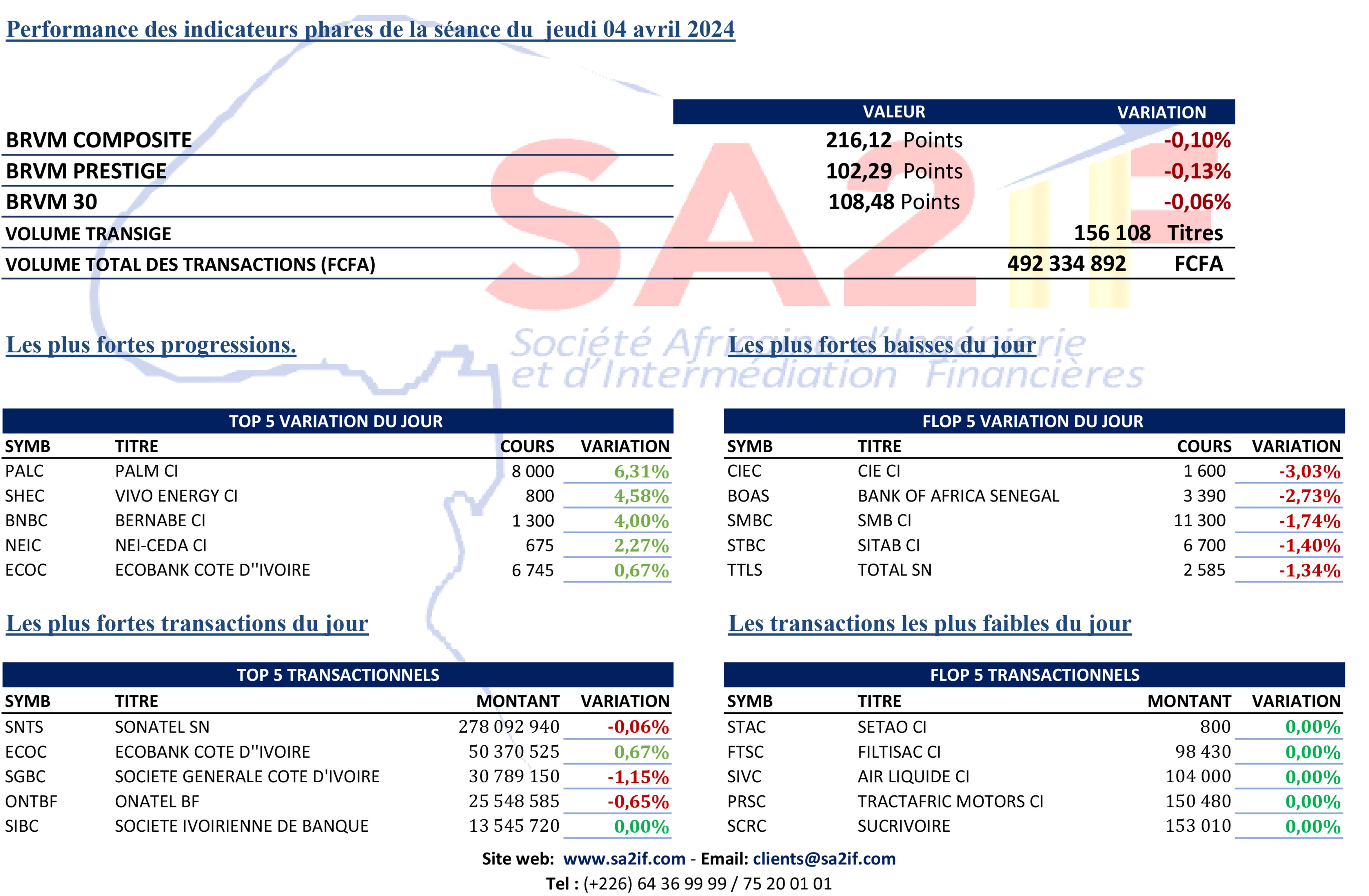 Toutefois, les 3 meilleures performances sont composées de Palm CI qui garde sa place (+6,31%), suivie par Vivo Energy CI (+4,58%) et Bernabe CI (+4,00%).