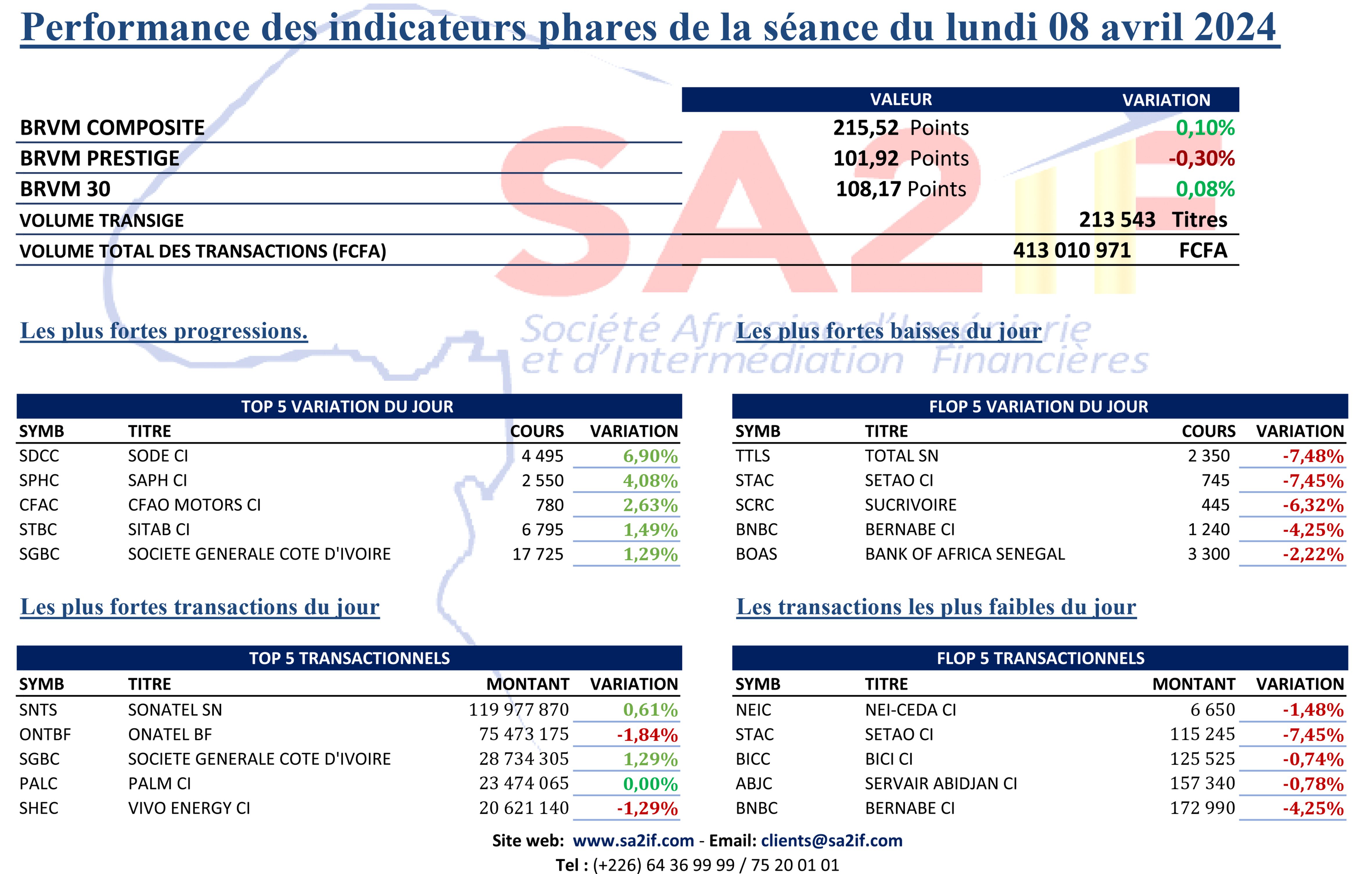Au titre des 3 meilleures performances de la journée, nous avons en tête, Sode CI(+6,90%) , suivie par Saph CI (+4,08%) et CFAO Motors CI (+2,63%) qui referme la marche.