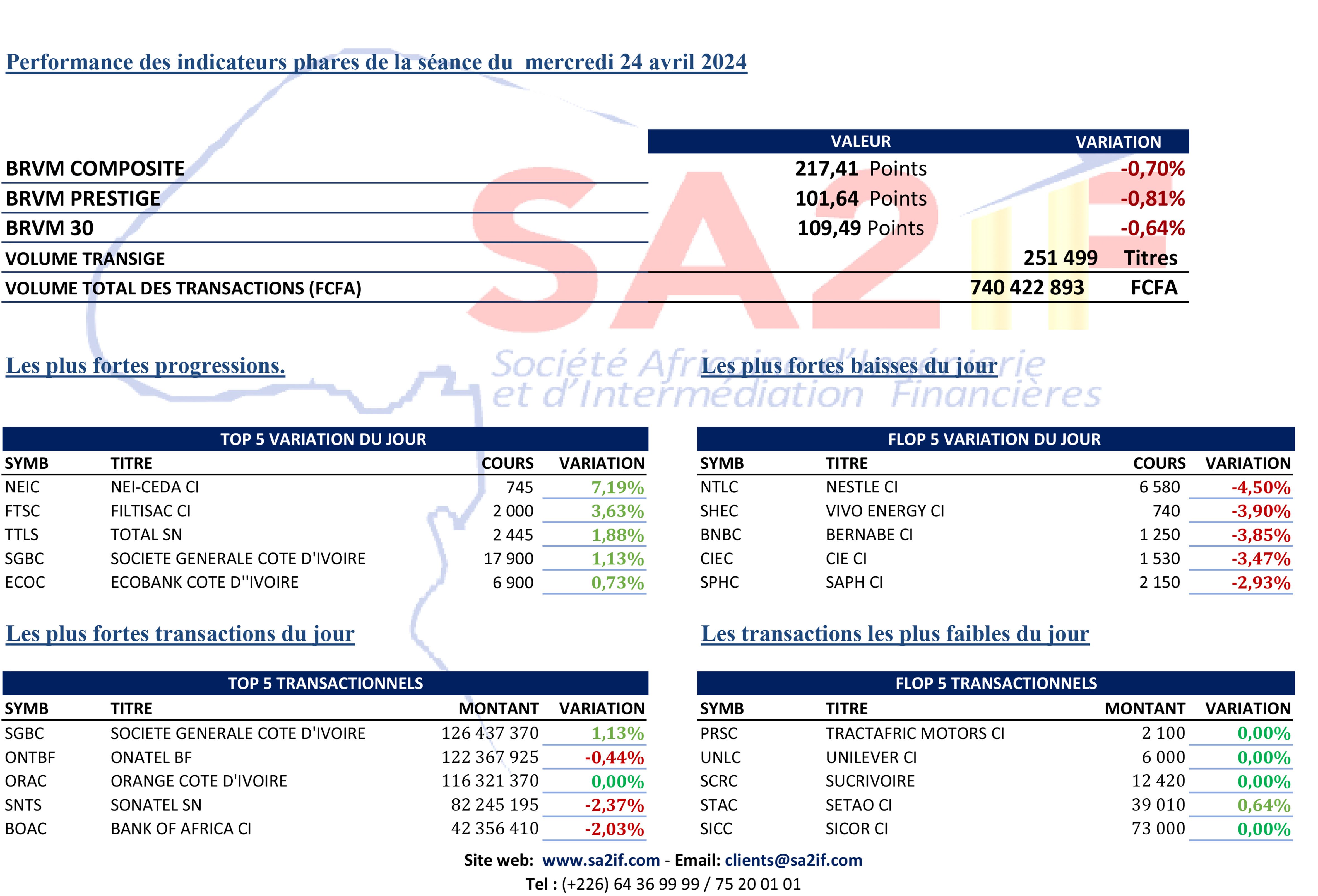 Transaction Sur Dossier: : La Bourse Régionale des Valeurs Mobilières (BRVM) porte à la connaissance du public et des intervenants du marché qu’une transaction sur dossier a été réalisée ce mercredi 24 avril 2024.
