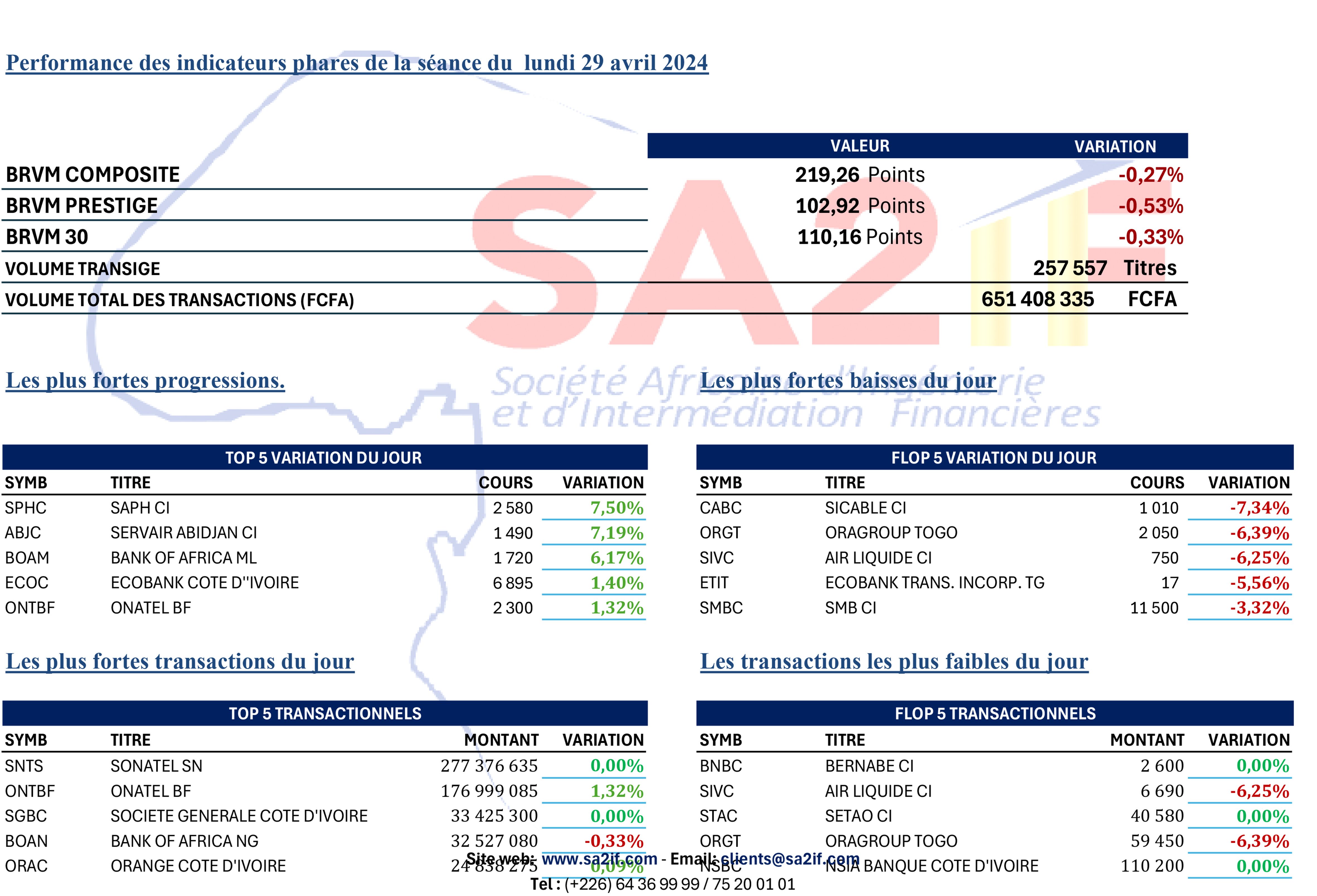 Le top 3 est composé de Saph CI (+7,50%) suivie par Servair Abidjan CI (+7,19%) soutenue par son important rendement dividende (le plus élevé du marché pour l’instant 13,84%) et BOA ML (+6,17%) qui referme la marche.