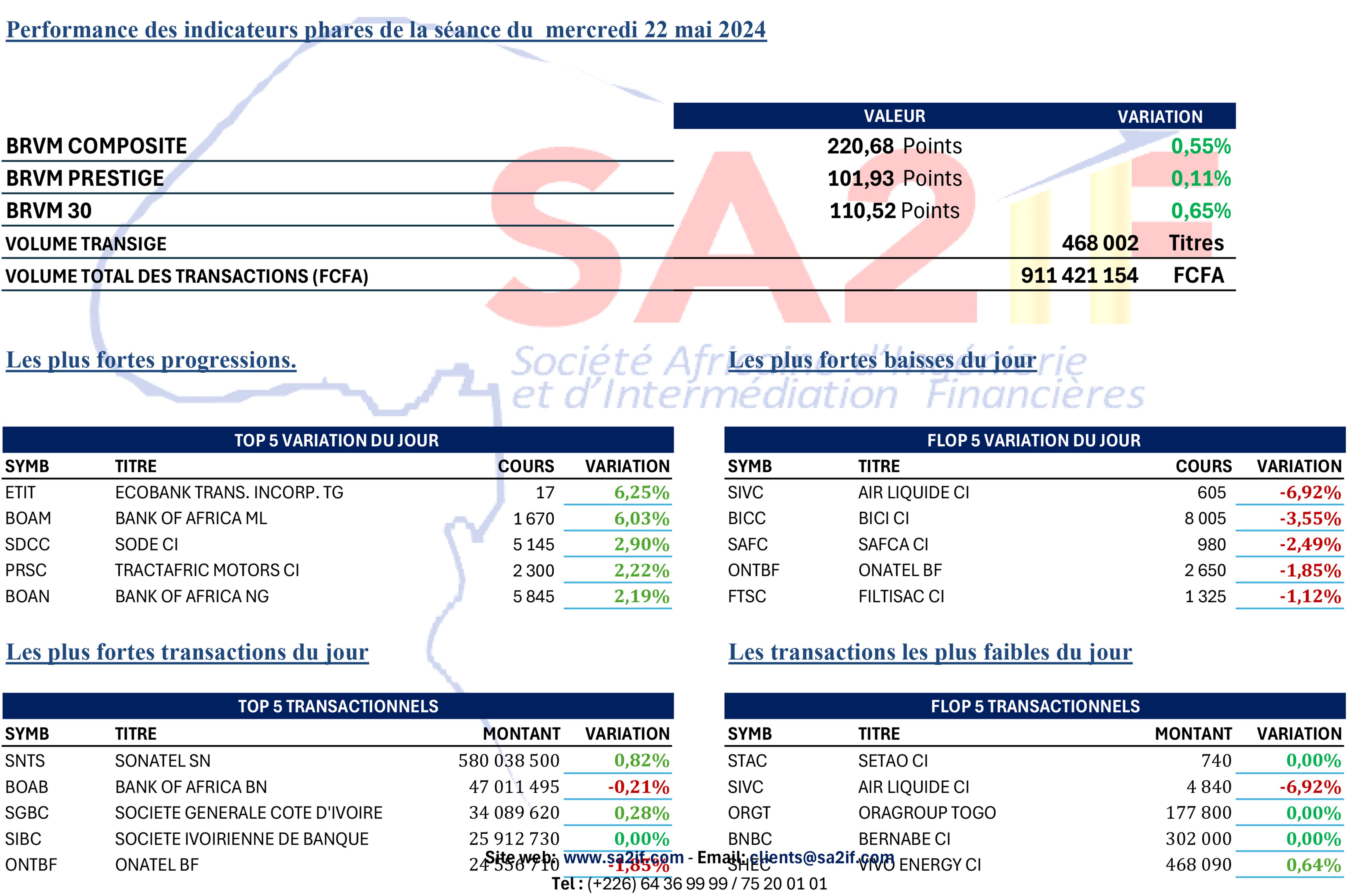 Commentaire des variations : Globalement le marché des actions de la BRVM a rebondi, clôturant dans le vert lors de la séance de cotation du jour. Ce retournement de tendance par rapport à la séance d’hier, s’est ressenti sur les trois indices phares du marché avec principalement celui représentatif du marché, le BRVM Composite qui a évolué de +0,55% affichant 220,68 points à la clôture.