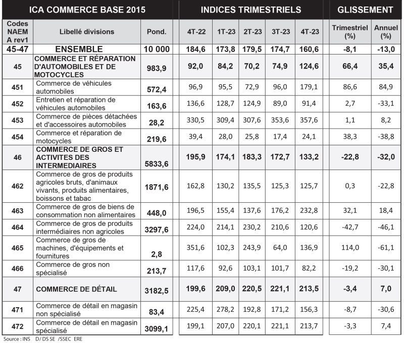 On observe une baisse de « 8,1% de l’indice global au 4e trimestre 2023 ». C’est ce qui ressort de la note trimestrielle de l’Indice de chiffres d’affaires dans le secteur du commerce, publié en avril 2024, par l’Institut national de la statistique et de la démographie (INSD). Un ralentissement de l’activité économique qui a été observé dans le secteur du commerce déjà au troisième trimestre 2023 et qui s’est accentué durant la fin d’année 2023.  Cette régression est dû essentiellement à la baisse du niveau des indices dans les branches « commerce de gros et activités des intermédiaires de gros » (-22,8%) et du « commerce de détail » (-3,4%). La hausse enregistrée dans la branche « commerce et réparation d’automobiles et de motocycles » (66,4%) n’a pas pu inverser la tendance baissière de l’indice. Autre point à noter, comparé au 4e trimestre 2022, l’indice global dans le commerce a baissé de 13%.