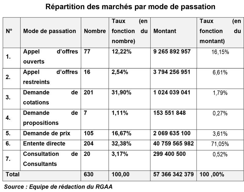 A noter que sur 630 marchés audités, le montant des marchés par entente directe représente 71,05%. La proportion des marchés par demande de propositions est de 0,27% du montant. Sur le plan financier, les marchés par entente directe s’élèvent à 40.759.565.982 FCFA sur les 57.366.342.372 FCFA. Les appels d’offres restreints représentent 3.794.256.951 FCFA, à l’inverse, les appels d’offres ouverts ont coûté 9.256.892.957 FCFA. o