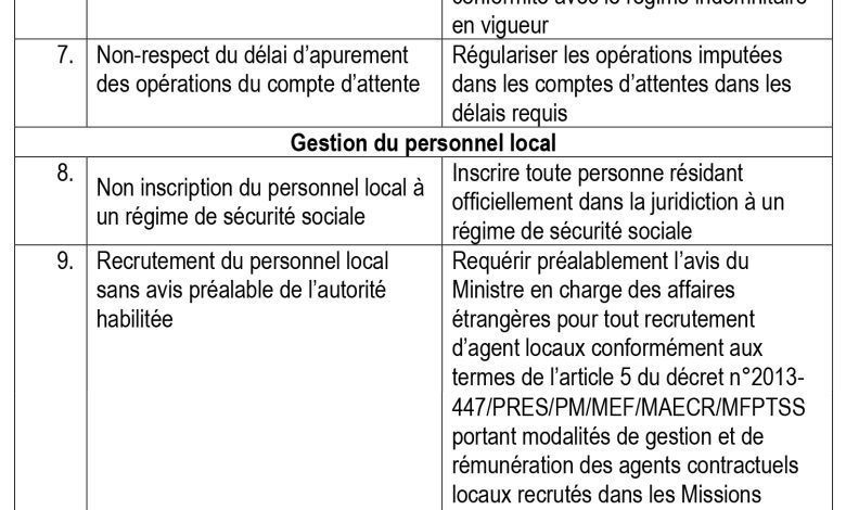 L’Inspection générale des finances (IDF), gendarme des dépenses publiques, s’est penchée sur la gestion des dépenses publiques de 10 missions diplomatiques et consulaires burkinabè à l’extérieur du pays. Aucune irrégularité de gestion financière n’a été décelée. Cependant, des recommandations ont été faites à l’issue du travail des agents de l’IGF. Elles sont adressées aux premiers responsables des missions diplomatiques et consulaires suivantes : Addis-Abeba ; Bamako ; Djeddah ; Caire ; Vienne ; Copenhague ; Brasilia ; Nations-Unies ; Ankara et Genève (voir tableau 3). En rappel, l’IGF a épluché les dossiers figurant dans la gestion financière et comptable ; la comptabilité des matières ; la gestion du personnel local ; la gestion de la scolarité et la gestion du carburant.