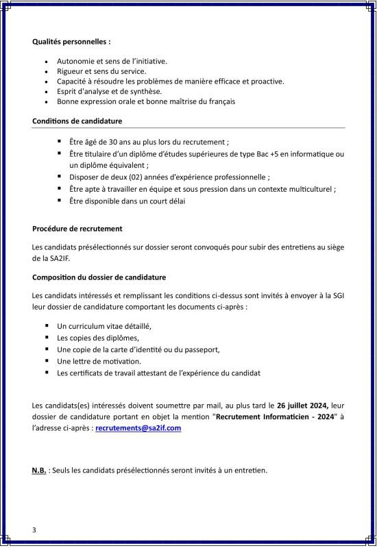 Dans le cadre du renforcement de son effectif, la SA2IF souhaite recruter un informaticien titulaire d’un Master en informatique, d’un diplôme d’ingénieur de conception ou de tout autre diplôme bac + 5 jugé équivalent.