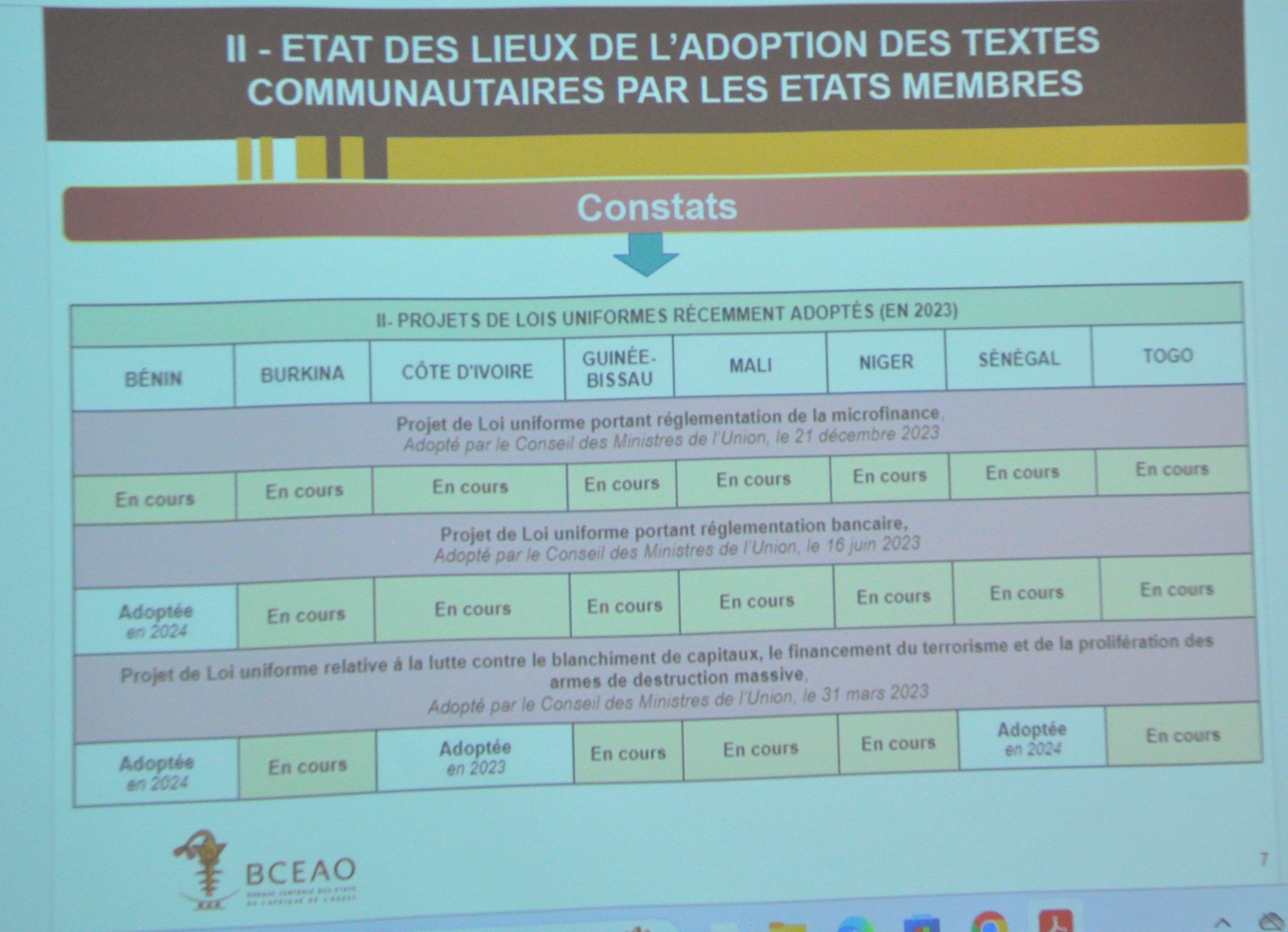 L’approbation du rapport définitif de contrôle des comptes des organes de l’UEMOA au titre de l’exercice 2022, ainsi que du projet de décision portant adoption des guides à l’usage des juridictions financières de l’UEMOA. Cette décision vient, en effet, renforcer les mécanismes concourant à l’efficacité de l’action des organes de contrôle des Etats de l’Union. L’approbation des comptes annuels de l’AMF-UMOA au titre de 2023 a permis de mettre en œuvre les prérogatives qui sont dévolues par les textes régissant l’Union. L’approbation des résultats des travaux de la Commission spéciale pour la sélection du Contrôleur national de la BCEAO pour le Niger au titre des exercices 2024 à 2029 permet d’achever ce processus essentiel pour la vérification des comptes de l’institut d’émission. La présentation du point sur l’état d’adoption des textes communautaires, principalement les lois uniformes adoptées par le Conseil en 2023, invite à une accélération des procédures requises, en vue de leur insertion dans les ordonnancements juridiques nationaux, afin de permettre l’atteinte des objectifs visés par ces importantes réformes du secteur bancaire et financier.