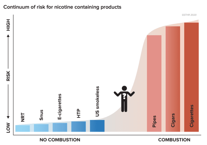 Le schéma 2 montre la corrélation entre les différents dispositifs d’apport de nicotine et leur niveau de risque connu pour la santé. Sur la partie droite, où le risque sanitaire est le plus élevé, se trouvent les dispositifs combustibles (pipes, cigares et cigarettes). En bleu, sur la partie gauche, sont placés les dispositifs ne faisant pas intervenir une combustion dans leur processus d’apport de nicotine tels que les thérapies de substitution vendues en pharmacie (gomme à mâcher, patch cutané, spray buccal), le sachet buccal, l’e-cigarette, le tabac chauffé. Le risque posé par les produits de cette catégorie n’est pas équivalent à zéro, ils forment toutefois une panoplie d’alternatives à risque réduit par comparaison aux produits combustibles (95% de réduction avec l’e-cigarette, par exemple).