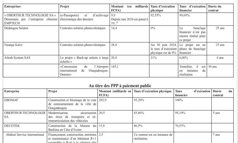 Au titre des PPP à paiement par les usagers, il y a le projet de « construction et exploitation d’un système d’émission de passeports à puce électronique (e-Passeports) et d’archivage électronique des dossiers sous forme de BOT (2018-2022) » contracté en 2017 avec l’entreprise « OBERTHUR TECHNOLOGIE SA » pour un montant initial de 9,6 milliards FCFA. La Loi de finances initiale (LFI) révèle que ledit contrat a fait l’objet d’un avenant qui a porté le montant à 9,9 milliards FCFA et la durée du contrat au 1er juillet 2024. Au 30 juin 2024, le taux d’exécution physique est de 92,55% et le taux financier de 99,69%. La LFI mentionne aussi le projet pour le financement, la construction et la maintenance d’un système d’émission de passeports biométriques en polycarbonate munis de puce électronique (e-Passeports) et d’archivage électronique des dossiers. Avec ce contrat, la rupture de coopération entre l’Etat burkinabè et français a engendré la signature d’un nouveau contrat signé le 14 mai 2024, avec l’entreprise chinoise EMPTECH pour une durée de 5 ans. Le montant du contrat s’élève à 19, 7 milliards FCFA. Pour permettre aux Burkinabè résidant en Côte d’Ivoire d’avoir des cartes consulaires sécurisés, l’Exécutif burkinabè a signé un PPP de 12,5 milliards FCFA, avec la société SNEDAI-Burkina, le 11 septembre 2013, pour une durée de 10 ans. Depuis septembre 2023, le gouvernement du président du Faso, le Capitaine Ibrahim Traoré, a mis fin à ce contrat.