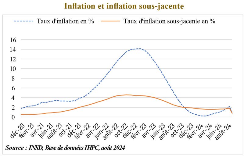 Le taux d’inflation, en moyenne annuelle, s’affiche à 2,2% en août 2024, en hausse de 0,7 point de pourcentage par rapport au mois précédent. Cette hausse du niveau général des prix est liée à la progression des prix, notamment, des fonctions « Produits alimentaires, des boissons non alcoolisées » (+1,9%), « Logement, eau, électricité, gaz et autres combustibles » (+9,9%), « Santé » (+2,9%), « Hôtels, café, restaurants » (+2,7%), « Transports » (+1,9%) et « Enseignement » (2,6%), atténuée par la baisse de « Boisson alcoolisée, tabacs et stupéfiants » (-0,9). Le taux d’inflation sous-jacente s’est affiché à 1,8%, en hausse de 0,1% par rapport au mois précédent. Ce taux permet, en effet, de donner des informations complémentaires sur les tendances de fond de l’évolution des prix. Le taux d’inflation annuel moyen est la variation du niveau de l’Indice national harmonisé des prix à la consommation (INHPC) entre deux années consécutives. L’INHPC mesure entre deux périodes, l’évolution moyenne des prix de biens et services du panier harmonisé au niveau des pays de l’UEMOA, consommés par les ménages. Il est calculé mensuellement. L’indice annuel est une moyenne simple des indices élémentaires mensuels. Le taux d’inflation sous-jacente est un taux obtenu à partir de l’indice désaisonnalisé. Il exclut les produits à prix volatil tels que les produits frais et l’énergie qui influencent le plus souvent l’évolution de l’indice.