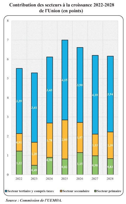 Sur la période 2025-2028, la contribution du secteur primaire à la croissance de l’Union serait relativement stable, en raison de la forte incertitude sur la production agricole qui demeurerait irrégulière du fait des conséquences du dérèglement climatique. Pour ce qui est du secteur secondaire, il bénéficierait de la dynamique des branches « construction » et « activités extractives », avec la mise en œuvre efficace des projets structurants d’investissement public inscrits dans les Plans nationaux de développement. Quant au secteur tertiaire (y compris les taxes nettes sur les produits), il serait particulièrement vigoureux, grâce à l’ensemble de ses branches, notamment, le commerce et le transport.