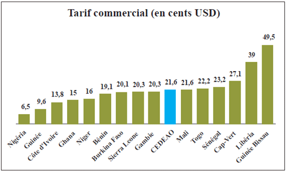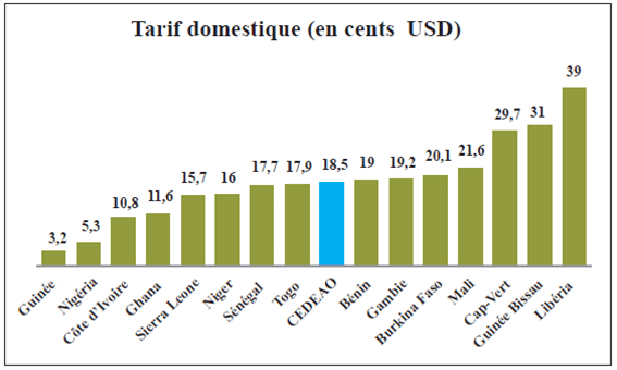 Le tarif moyen du kWh domestique dans l’espace CEDEAO est de 18,52 cents USD. Il se caractérise par une forte variation d’un pays à l’autre, avec un écart moyen de 9,10 cents USD, un tarif minimum de 3,2 cents USD en Guinée et un tarif maximum de 39 cents USD au Liberia.