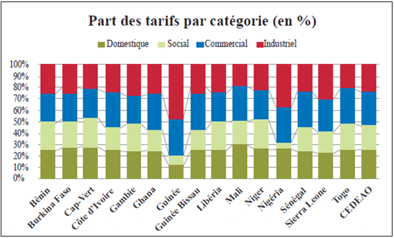 L’analyse de la part relative du niveau de chaque catégorie tarifaire est illustrée par le graphique ci-dessous. Elle permet d’apprécier la politique de redistribution souhaitée par chaque pays. Ainsi, un pays comme la Guinée qui a des tarifs sociaux et domestiques très bas, et fait payer relativement plus cher l’énergie à ses industries.
