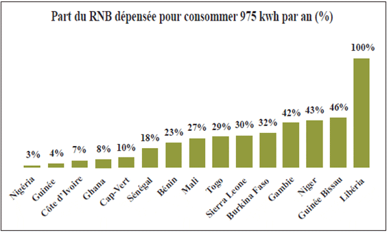 Ainsi, les pays à faibles revenus sont doublement handicapés en matière d’accès à l’électricité, à savoir des revenus faibles pour faire face à des tarifs très élevés. Ainsi que l’illustre le graphique suivant, au Liberia, par exemple, pour consommer 975 kWh par an, un ménage de la classe moyenne dépenserait 100% de son revenu ; tandis que son voisin de la Côte d’Ivoire ne dépenserait que 7% de son revenu.