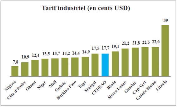 Le tarif moyen du kWh pour les industriels dans l’espace CEDEAO est de 17,70 cents USD. Il se caractérise par une forte variation d’un pays à l’autre, avec un écart moyen de 7,17 cents USD ; un tarif minimum de 7,8 cents USD au Nigeria et un tarif maximum de 39 cents USD au Liberia.