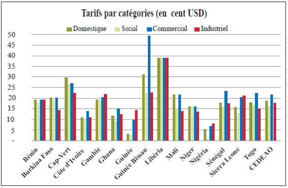 Le tarif social moyen du kWh dans l’espace CEDEAO est de 16,13 cents USD. Il se caractérise par une forte variation d’un pays à l’autre, avec un écart moyen de 8,99 cents USD ; un tarif minimum de 1,1 cent USD au Nigeria et un tarif maximum de 39 cents USD au Liberia. Ce tarif est adapté pour des consommateurs modestes (éclairage et poste radio ou téléviseur, au plus) ayant de faibles consommations. La tarification est donc conséquente (tarifs progressifs) pour dissuader les « faux sociaux » dans la plupart des pays.