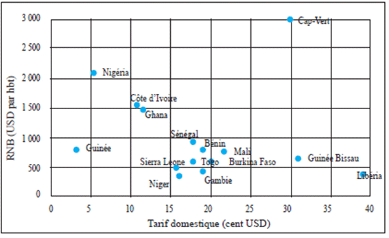 En vue d’apprécier la capacité des ménages à se procurer l’énergie selon les tarifs de chaque pays, une analyse du lien entre le Revenu national brut (RNB) et le niveau des tarifs domestiques a été faite. Ainsi que la présente les graphiques suivants, il semblerait qu’il y ait globalement un lien négatif entre le niveau de RNB et les tarifs d’électricité (Guinée et Cap-Vert exclus).