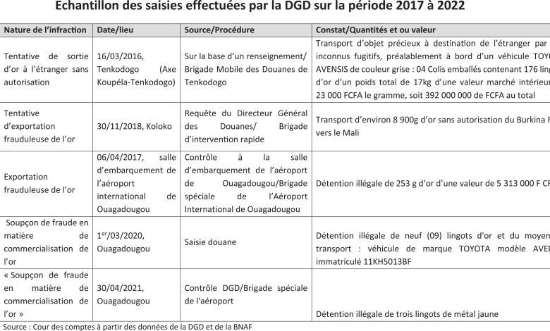 La DGD joue un rôle crucial dans la surveillance des exportations et importations. Elle a pour mission le recouvrement des recettes de portes et de la TVA pour le compte de la DGI ; la mise en œuvre des exonérations et allègements relatifs aux droits de douane prévus par le Code minier au bénéfice du secteur extractif ; le contrôle des exportations des substances précieuses. En 2022, les droits de douane collectés ont atteint 67,3 milliards FCFA, soit une augmentation de 20 % par rapport à 2018. Des saisies importantes témoignent de l’ampleur de la fraude. En 2021, les douaniers ont saisi 9 lingots d’or d’origine illégale à Ouagadougou, d’une valeur estimée à plusieurs centaines de millions FCFA.