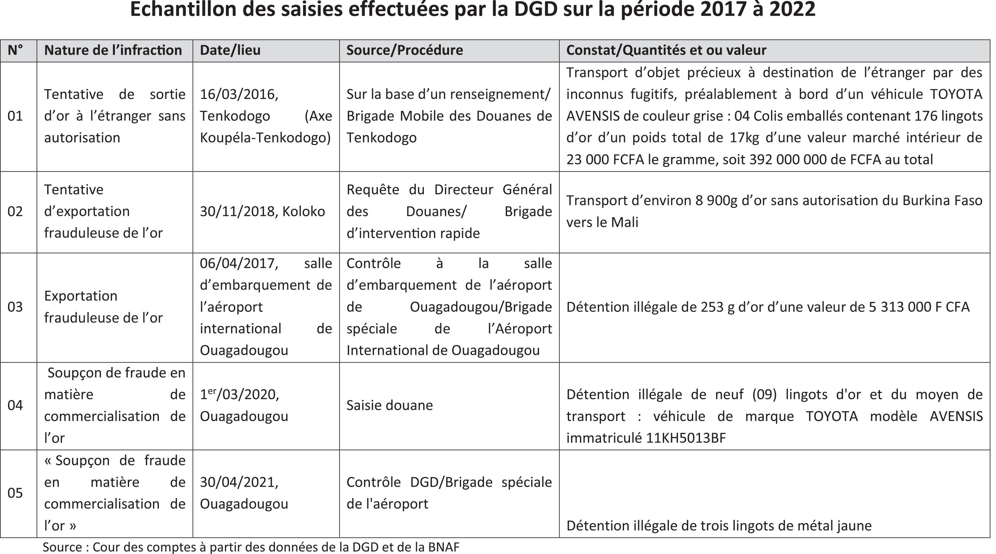 En témoigne l’affaire sur la saisie de 61kg d’or, par la Brigade mobile des Douanes de Koudougou. La BNAF, saisie de l’affaire, n’a pu conclure d’accord avec le contrevenant. La BNAF a eu gain de cause, suite à un premier jugement au Tribunal de Grande instance (TGI) de Koudougou. Elle n’a pas demandé confiscation et saisie dudit or, afin de le vendre pour rentrer dans ses droits. « En appel, le jugement a été infirmé en faveur du comptoir M…, avec une décision du juge indiquant de lui restituer l’or. La BNAF s’est pourvue en cassation, mais a pris la décision de remettre l’or sans attendre le dénouement du procès et sans aucune garantie ou caution. Or, l’article 412-2 al1 du Code de procédure pénale dispose que « pendant les délais du recours en cassation, et s’il y a eu recours jusqu’au prononcé de la décision de la Cour de cassation, il est sursis à l’exécution de la décision frappée de pourvoi, sauf en ce qui concerne les condamnations civiles ». « Avec la remise de l’or, les intérêts de l’Etat n’ont pas été sauvegardés », conclut le rapport d’audit de la Cour des comptes.