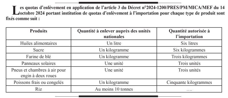 Avant le décret du 4 septembre 2024, d’autres arrêtés avaient été pris sur certains produits. Le 9 avril 2024, par exemple, le gouvernement burkinabè suspendait jusqu’à nouvel ordre, sur toute l’étendue du territoire national, l’importation de la farine de blé, en vue d’assainir le marché des produits de grande consommation. Le 12 avril, un arrêté fixait un quota de l’enlèvement des panneaux solaires, précisant qu’un panneau solaire acheté auprès des unités nationales pour 3 panneaux solaires à importer.