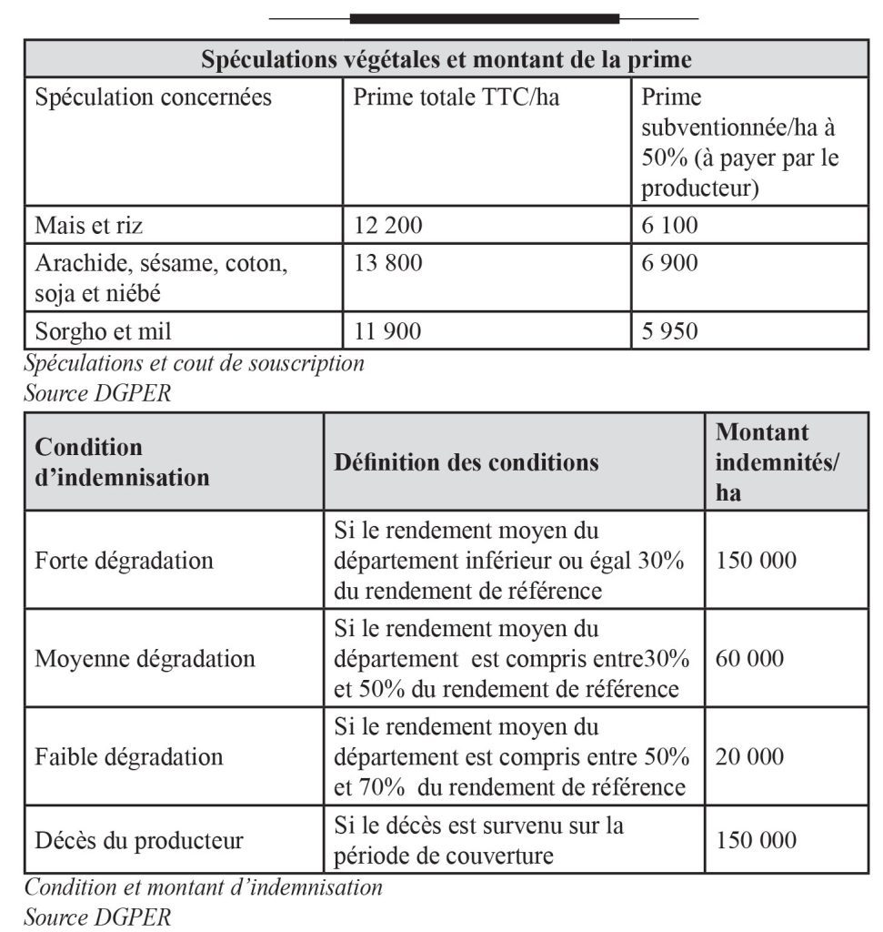 Si nous avons une baisse qui est comprise entre 70% et 50%, l’indemnisation est fixée à 60.000 FCFA. Et si nous avons une baisse qui est comprise entre 30% et 50%, nous avons une indemnisation par hectare qui est fixée à 20.000 FCFA. Et lorsque malheureusement on a un décès, pendant la période qui est couverte par l’assurance également, il y a une indemnisation qui est fixée à 150.000 FCFA. Il faut préciser que l’indemnisation en cas de décès n’exclut pas, lorsqu’il y a survenu du sinistre, que les ayants droit bénéficient de l’indemnisation en cas de baisse de rendement », a expliqué le DGPER.