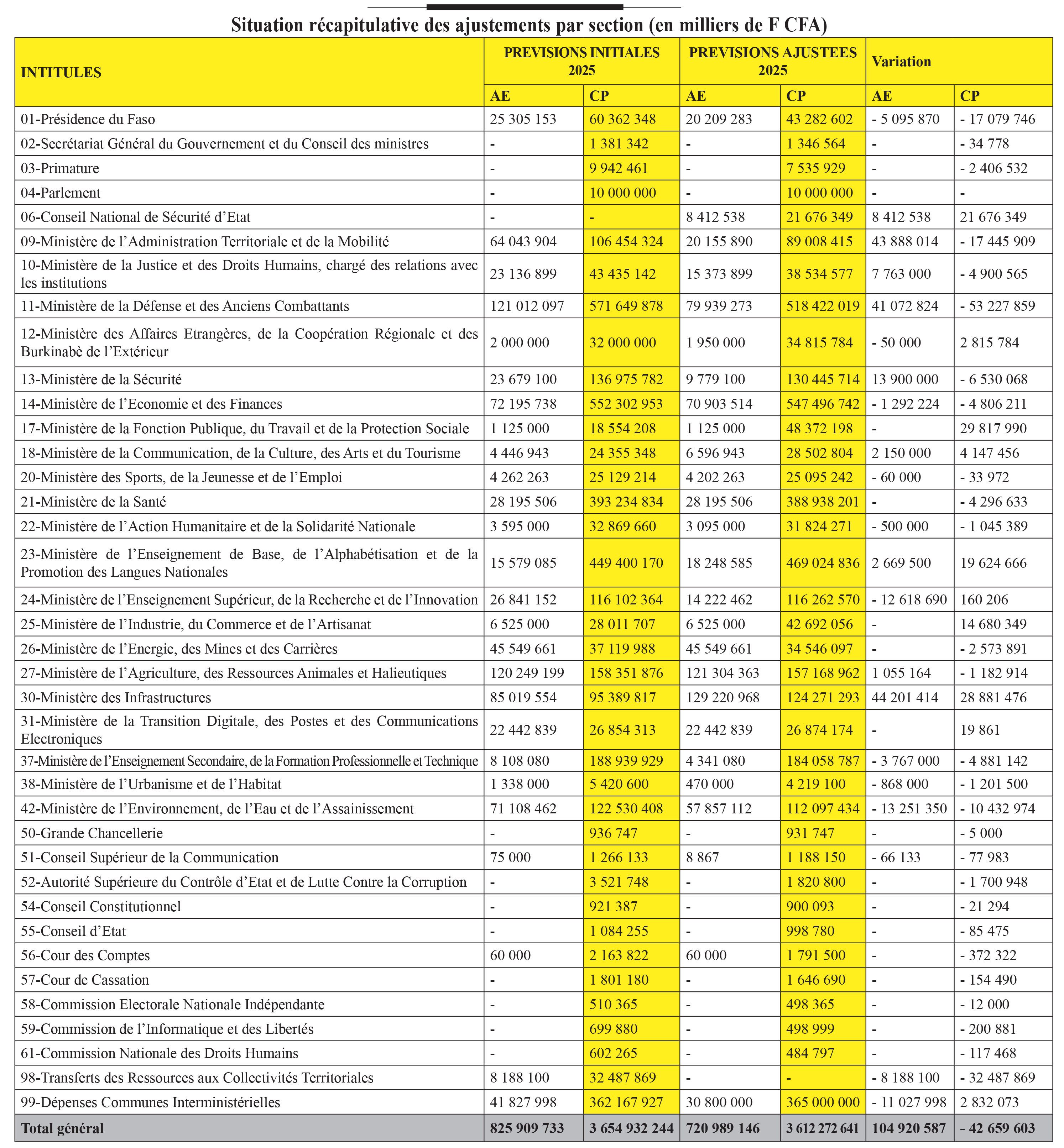 Selon l’exposé des motifs 2025, document partagé lors de l’adoption de la loi de finances, exercice 2025 à l’Assemblée Législative de Transition (ALT), le 24 décembre 2024, les arbitrages ont été effectués sur la base d’un certain nombre de critères.