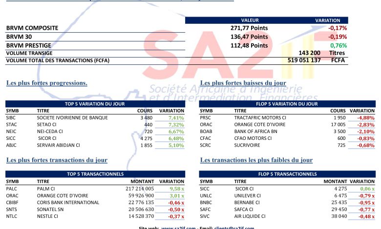 Orange Côte d’Ivoire (ORAC) s’impose en tête des transactions avec un montant de 203,72 millions FCFA, malgré une variation négative de 3,05 %, tandis qu’Unilever CI (UNLC) affiche l’un des montants les plus faibles à 12 950 FCFA.