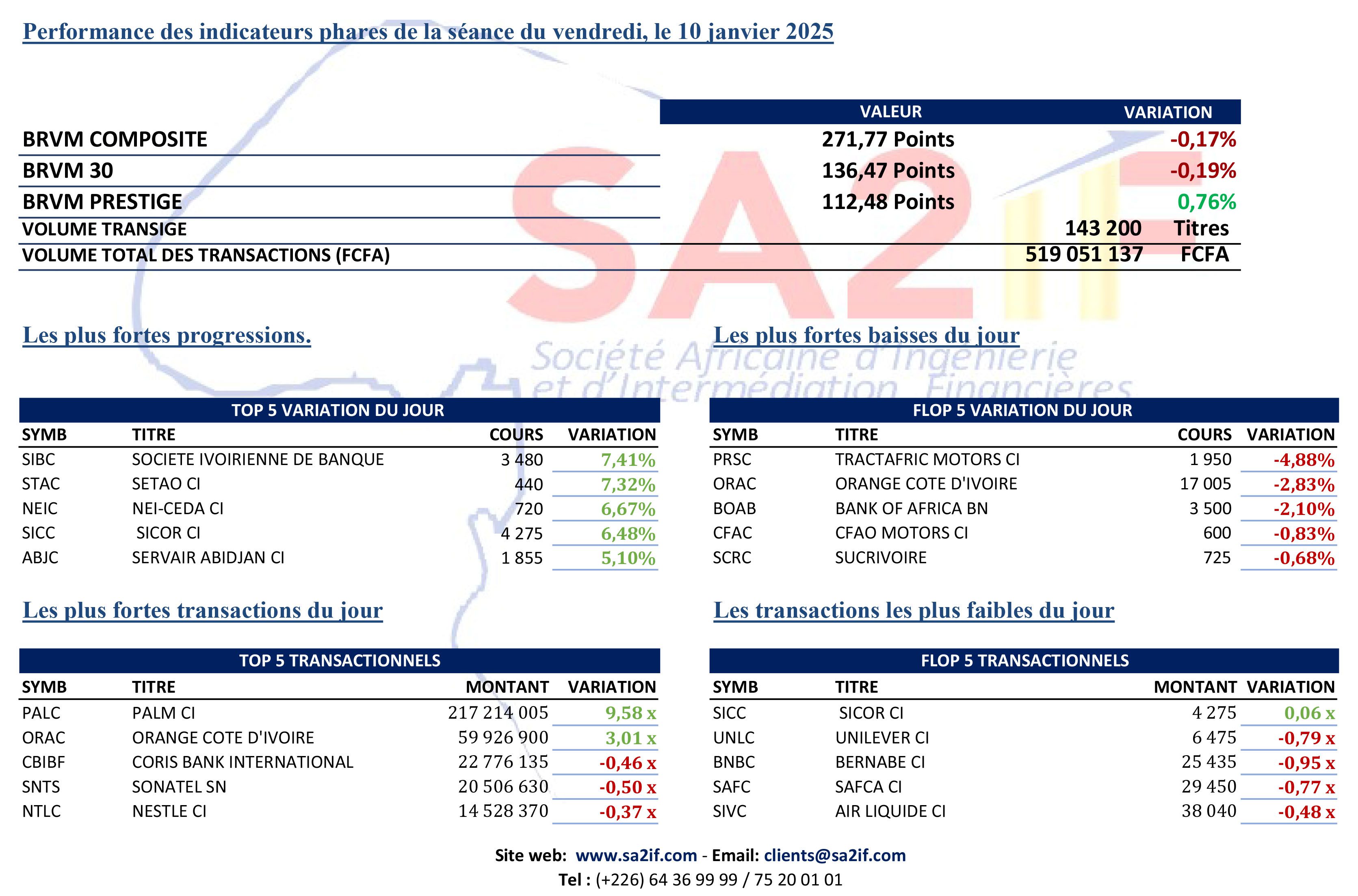 La séance boursière du mercredi 8 janvier 2025 a été marquée par une baisse généralisée des principaux indices, avec le BRVM Composite en recul de 0,46 % à 273,13 points, et le BRVM 30 de 0,49 % à 137,19 points. Le volume total des transactions s’élève à 762,73 millions FCFA pour 2,4 millions de titres échangés.
