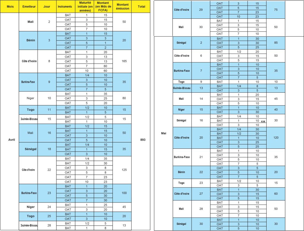 • Selon le calendrier provisoire des émissions de Umoa-Titres