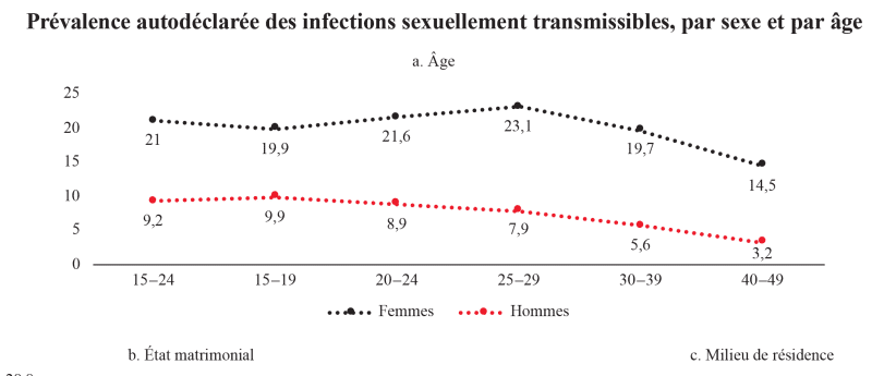 Le Burkina Faso s’est engagé à lutter vigoureusement contre les maladies sexuellement transmissibles (MST), depuis que le premier cas de SIDA a été détecté dans le pays en 1986. Les programmes de réponses nationales face à la recrudescence des infections sexuellement transmissibles (IST), notamment, le Programme national de lutte contre le SIDA (PNLS10), font partie des priorités du pays, en vue de respecter les engagements pris pour mettre un terme à cette épidémie. Selon les données de l’EDS de 2021, au Burkina Faso, en moyenne 12,9 % des personnes âgées de 15 à 49 ans ayant eu des rapports sexuels au moins une fois dans leur vie ont déclaré avoir eu une IST ou constaté la présence de ses symptômes au cours des 12 derniers mois. La ventilation par sexe montre que parmi les femmes âgées de 15 à 49 ans ayant déjà eu des rapports sexuels, 20 % déclarent avoir eu une IST ou des symptômes d’IST, alors que parmi les hommes âgés de 15 à 49 ans, le taux est de 6 %. On observe, cependant, d’importantes variations selon le sexe et selon certaines caractéristiques sociodémographiques [NDLR : voir illustration].
