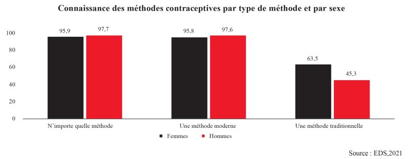 De manière globale, selon les données de l’EDS de 2021, 95,9 % des femmes maîtrisent une méthode de contraception quelconque, contre 97,7 % des hommes. Cependant, les disparités entre les femmes et les hommes en matière de connaissance des méthodes contraceptives sont plus importantes selon que la méthode est moderne ou traditionnelle.