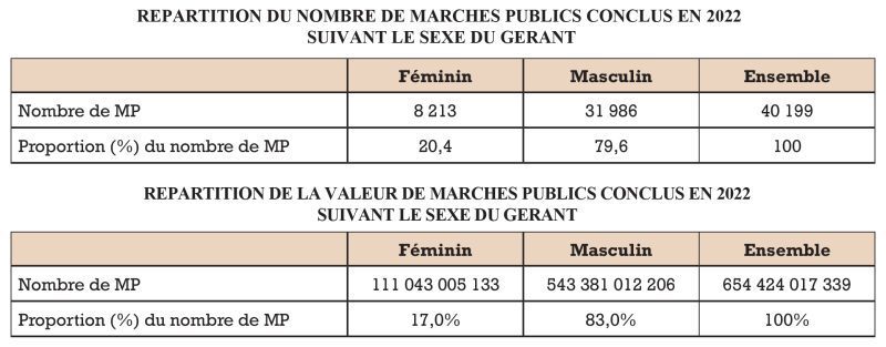 Autre information est que le nombre de marchés publics attribués aux entreprises dirigées par des femmes constitue un cinquième de l’ensemble, soit 20,4%, contre 79,6% pour les hommes. Les 8.213 MP obtenus par les femmes ont procuré la somme de 111.043.005.133 FCFA, contre 543.381.012.206 FCFA pour les hommes, soit un montant total de 654.424.017.339 FCFA.