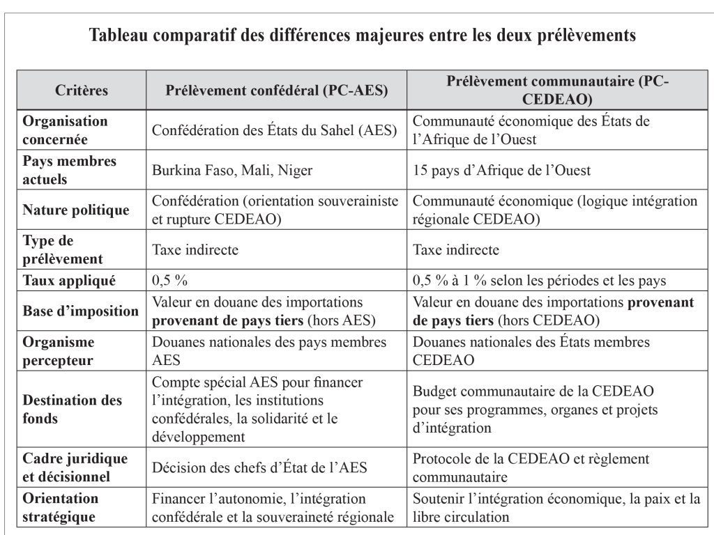 Ce qu’il faut retenir est que le Prélèvement confédéral de l’AES (PC-AES) et le Prélèvement communautaire de la CEDEAO (PC-CEDEAO) poursuivent un objectif similaire – financer l’intégration régionale – mais ils diffèrent sur plusieurs aspects, notamment, dans leur logique politique, leur champ d’application, leur taux et leurs institutions de rattachement.