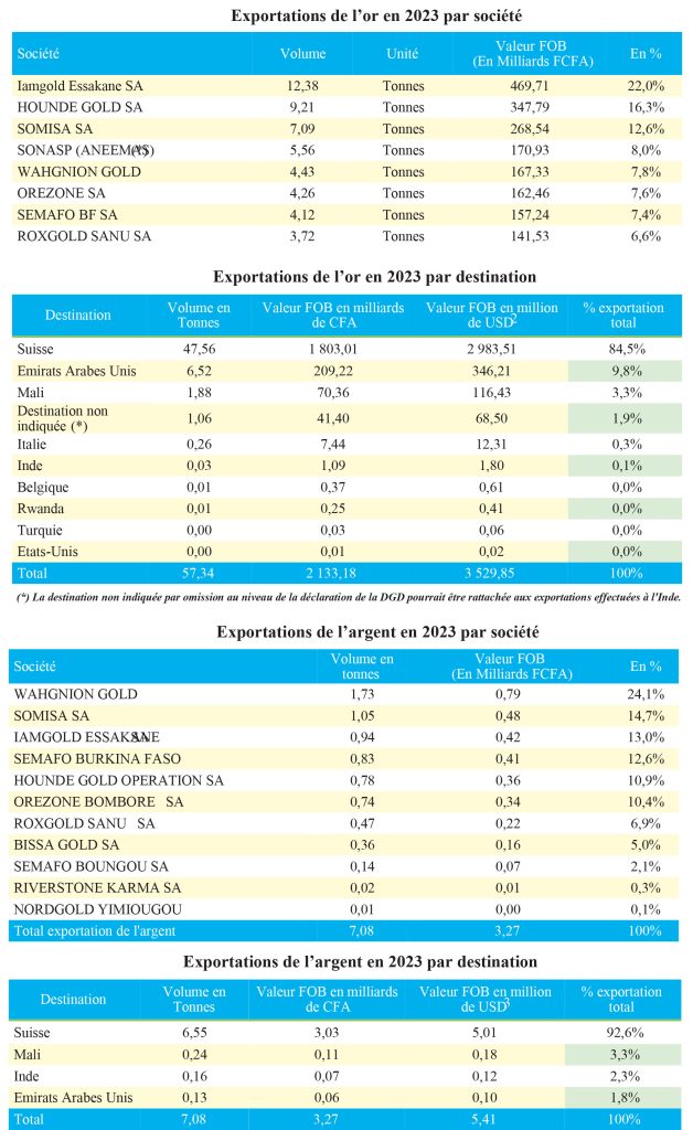 En 2023, les exportations d’argent déclarées par la Direction générale des Douanes (DGD) ont totalisé 7,08 tonnes, représentant une valeur de 3,27 milliards FCFA.La majorité des exportations d’argent (92,6%) étaient destinées à la Suisse, suivie par le Mali et l’Inde.Les exportations d’argent sont dominées par trois sociétés (Wahgnion Gold, Somisa SA, Iamgold Essakane SA) qui représentent 51,8% des volumes totaux exportés
