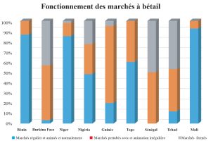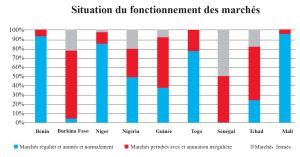 Dans les autres pays (Niger, Mali, Togo), même s’il a été signalé des perturbations dans le fonctionnement des marchés journaliers et hebdomadaires, aucune région n’a enregistré un taux de dysfonctionnement supérieur à 60% pour les marchés agricoles et 80% pour les marchés à bétail.