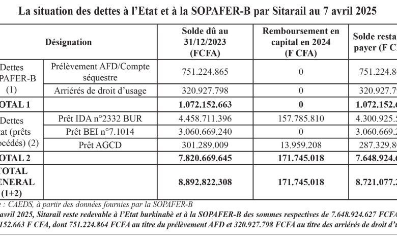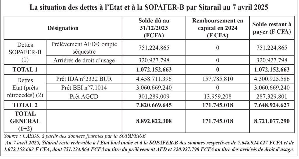 Dans les dispositions financières et tarifaires, Sitarail doit apurer le passif cumulé de la concession initiale qui comprend le service de la dette du Programme d’investissement d’urgence 1996-2001, les arriérés du droit d’usage au 31 décembre 2006, ainsi que les prélèvements effectués par l’AFD sur les comptes séquestres des Sociétés de patrimoine en paiement des échéances non honorées par SitaraiL. De plus, les dettes de SITARAIL envers les Etats (5.753.596.597 FCFA pour le Burkina Faso) seront remboursées sur un échéancier de 15 ans, avec un différé de 5 ans. Par ailleurs, les dettes des Sociétés de patrimoine (1.072.152.656 FCFA pour la Société de gestion du patrimoine ferroviaire du Burkina Faso) seront apurées selon un échéancier de 5 ans, à compter de la date d’entrée en vigueur de la CCR. Enfin, SITARAIL s’est aussi portée acquéreur du matériel roulant ferroviaire des deux Sociétés patrimoniales à un prix forfaitaire de 10 millions d’euros, soient 6.559.570.000 FCFA, payable sur un échéancier de 15 ans comportant un différé de 5 ans.
