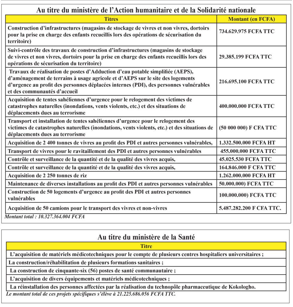 Tous ces projets au profit de la santé des Burkinabè va coûter un montant de 21.225.686.056 FCFA. Le ministère de la Santé et celui des Transports vont gérer le budget de l’Etat d’un montant de 31.553.050.060 FCFA.