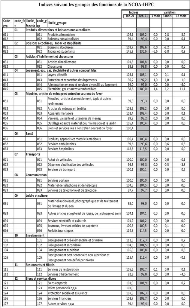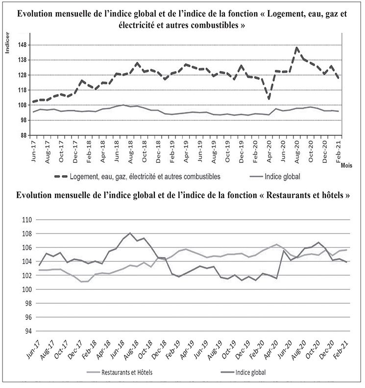 Il faut retenir que cette baisse de l’indice fait suite à une hausse de l’IPHC en janvier dernier de 0,2%. La hausse du niveau général des prix en janvier 2021 était consécutive non seulement à la hausse des prix dans les fonctions « Boissons alcoolisées, Tabac et stupéfiants », « Santé » et « Restaurants et hôtels », mais également à la baisse des prix dans la fonction « Produits alimentaires et boissons non alcoolisées ». Selon la volatilité, la hausse du niveau général des prix à la consommation est uniquement imputable aux hors produits frais et énergie. La hausse des prix des produits importés et des produits locaux a influencé la montée du niveau général des prix. Selon la durabilité, c’est la hausse des prix des produits non durables qui a influencé la situation haussière du niveau général des prix à la consommation. La hausse du niveau général des prix à la consommation est tributaire de la montée des prix des produits du secteur primaire et du secteur secondaire. o