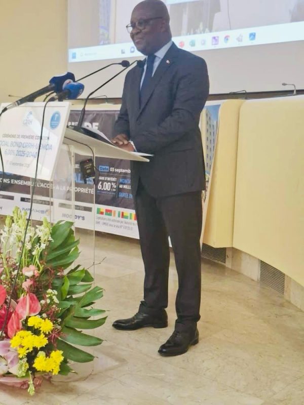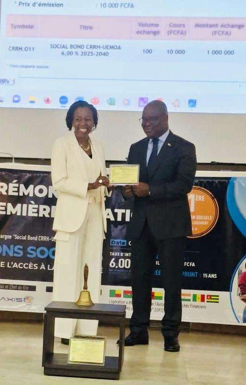 Le mercredi 3 septembre 2025, la Bourse régionale des valeurs mobilières (BRVM) a donc procédé à la cotation de l’emprunt obligataire de la Caisse régionale de refinancement hypothécaire (CRRH-UEMOA) dénommé « Social Bond CRRH-UEMOA 6% 2025–2040 » d’un montant de 60 milliards FCFA. Pour les différents acteurs, il s’agit d’une opération historique à fort impact social sur les populations de l’Union.