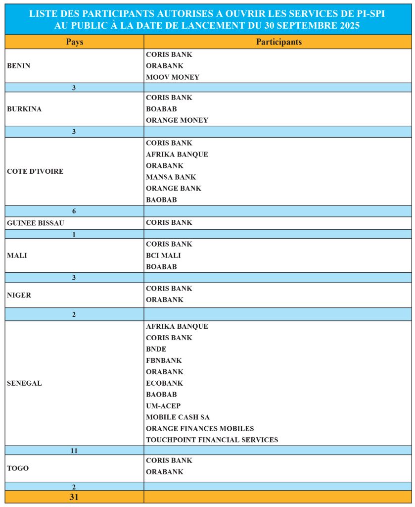 Et pour un lancement réussi, la Banque centrale a publié la liste par pays des participants autorisés à ouvrir les services de PI-SPI au public à la date de lancement. Ils sont au nombre de 31 pour les 8pays de l’Union, dont 3 au Burkina Faso. En tête, Coris Bank International et toutes les filiales présentes au Bénin, au Burkina, en Côte d’Ivoire, en Guinée-Bissau, au Mali, au Niger, au Sénégal et au Togo. La banque à Nassa devient ainsi le premier groupe à développer ce système sur toute l’Union. Une prouesse qui intervient quelques jours après sa notation favorable par l’agence Bloomfield.