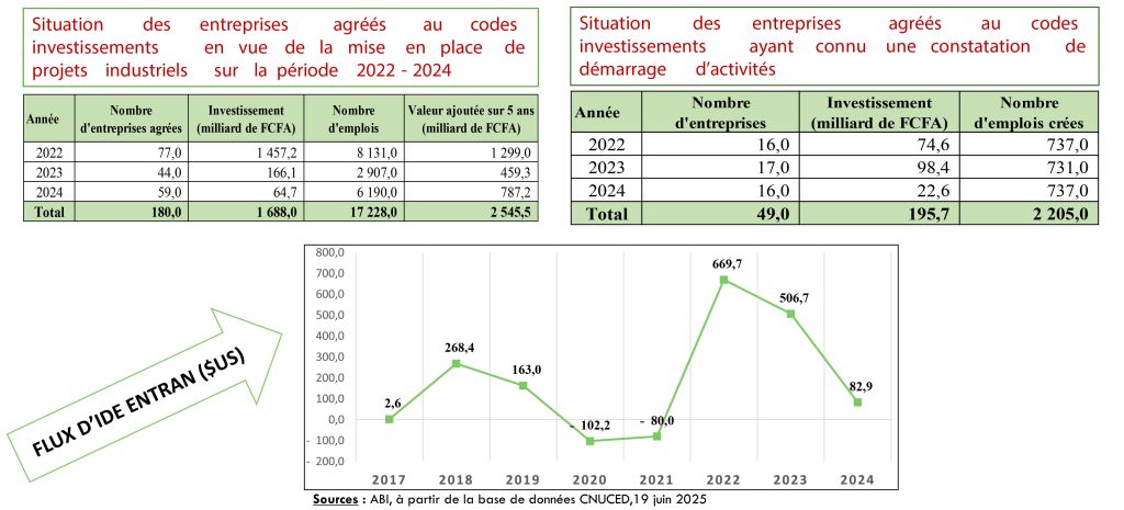 -Des secteurs d’opportunités tels que l’agro-industrie, les mines, les infrastructures. Le secteur des mines, par exemple, attire déjà de nombreux investisseurs. En 2024, l’encours des investissements directs étrangers (IDE) dans ce secteur attractif a atteint 668,422 milliards FCFA, soit 58% du total des IDE.