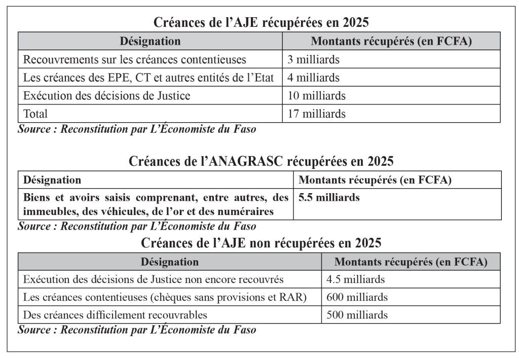 Il a fait cette révélation toujours dans l’émission 7Infos du dimanche 8 mars 2025. Il a évalué ces créances à plus de 1.000 milliards FCFA répartis de la façon suivante : les créances issues des décisions de Justice dont le portefeuille est d’environ 4,5 milliards FCFA en fin 2025 et les créances contentieuses (les chèques sans provisions et les restes à recouvrer (RAR) fournies par la Direction générale des Impôts (DGI) d’un montant d’environ 600 milliards FCFA. L’AJE a ajouté qu’un montant de 500 milliards FCFA se révélait être des créances difficilement recouvrables, toutefois, il a tenu à préciser que l’AJE est en train de travailler dessus avec la hiérarchie pour trouver une solution viable. Du reste, l’Exécutif burkinabè avait confirmé ces montants auprès des membres de la Commission des finances et du budget de l’Assemblée législative de transition (ALT) dont le rapport a été rendu public le 30 décembre 2025. A la date du 31 décembre 2025, il a été recensé par la DGI au titre des RAR, un montant de 1.082,34 milliards FCFA.