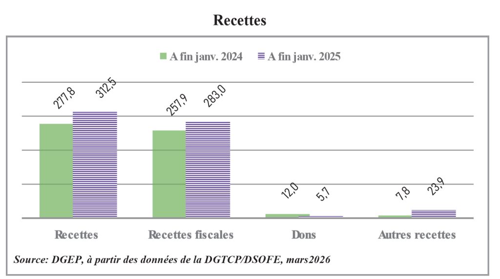 Afin janvier 2026, les recettes mobilisées s’élèvent à 312,5 milliards FCFA, en hausse de 12,5% (+34,7 milliards FCFA) par rapport à fin janvier 2025. Selon la Direction générale de l’économie et de la planification (DGEP), cette situation s’explique principalement par la progression des recettes fiscales et des autres recettes. Celles-ci ont représenté 283 milliards FCFA, pour les ressources issues des impôts et autres taxes. Il s’agit d’une hausse de 9,7% (+25 milliards FCFA) par rapport à fin janvier 2025. S’agissant des autres recettes, elles s’affichent à 23, 9 milliards FCFA, en hausse de 205,4% (+16,1 milliards FCFA). Quant aux dons, ils se situent à 5,7 milliards FCFA, en diminution de 53,0% (-6,4 milliards FCFA).