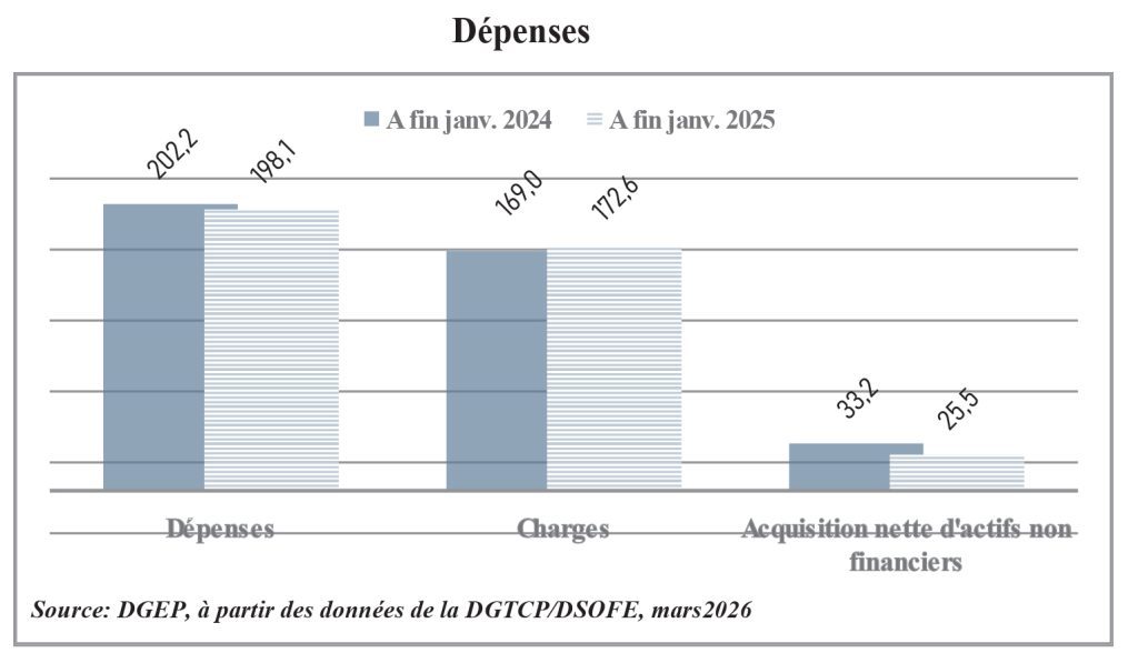 Les dépenses, elles, s’établissent à 198,1 milliards FCFA, en baisse de 2% (-4 milliards FCFA) par rapport à fin janvier 2025. Cette baisse est imputable aux acquisitions nettes d’actifs non financiers. Les charges progressent de 2,1% pour se situer à 172,6 milliards FCFA. Quant aux acquisitions nettes d’actifs non financiers (dépenses en capital), elles s’établissent à 25,5 milliards FCFA, en baisse de 23,0% par rapport à fin janvier 2025 (-7,6 milliards FCFA).