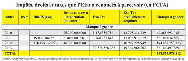Il ressort de l’étude qu’en 4 ans (2010-2013), le manque à gagner pour le budget national, en termes de recettes fiscales et douanières, du fait des exonérations fiscales et douanières, est évalué à 368,957 milliards de F CFA. Ces résultats de l’étude ont fait l’objet d’une présentation aux journalistes le 28 août 2014.