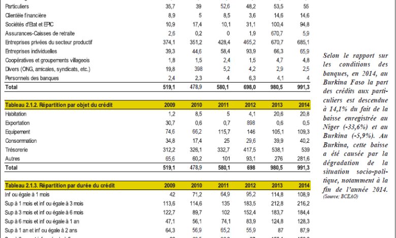 Toutefois, note le rapport, en 2014, la part des crédits aux particuliers est descendue à 14,1%, du fait de la baisse enregistrée au Niger (-33,6%) et au Burkina (-5,9%), ainsi que de l’importance de la décélération constatée en Côte d’Ivoire. Au Burkina, les crédits aux particuliers ont été sensibles à la dégradation de la situation socio-politique, notamment à la fin de l’année 2014. Au Niger, la situation sécuritaire pourrait être un facteur explicatif de la baisse des crédits aux particuliers.