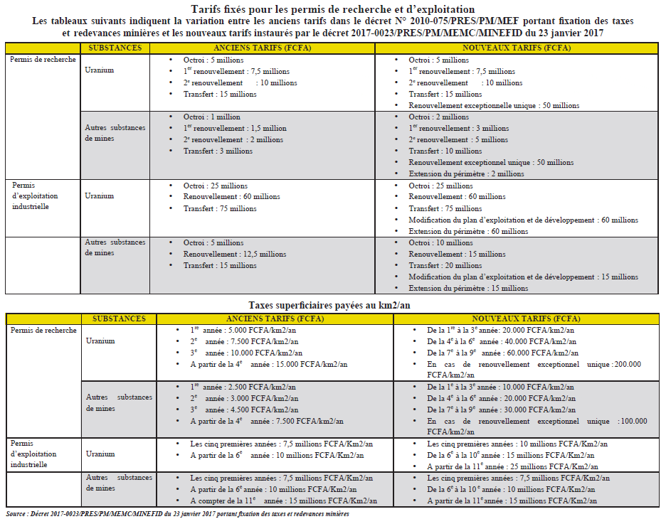 La grande innovation est l’institution d’un tarif de 50 millions pour le renouvellement exceptionnel unique des permis de recherche d’uranium et des autres substances de mines. Pour les permis d’exploitation industrielle, les innovations majeures portent sur l’institution d’un montant de 15 millions de FCFA en cas de modification du plan d’exploitation et de développement et d’un montant de 15 millions de FCFA pour l’extension du périmètre.