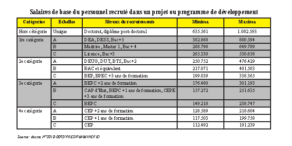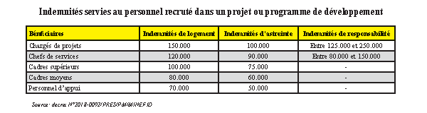 Le projet ou le programme recrute aussi un personnel en dehors des agents de l’Etat. Dans ce cas, ces agents percoivent une rémunération sur la base d’une grille salaraiale et indemnitaire spécifique. La lecture de la grille salariale indique qu’un coordonnateur d’un projet ou d’un programme bénéficie d’un salaire de base mensuel brut dont le montant varie entre 635.561 et 1.082.593 FCFA en fonction de son anciennneté dans le projet. En plus, il lui est servi mensuellement une indemnité de responsabilité dont le montant varie entre 125.000 et 250.000 FCFA en fonction du budget global du projet; une indemnité d’astreinte fixe de 100.000 FCFA et une indemnité de logement fixe de 150.000 FCFA. La somme du salaire et des indemnités indique qu’un coordonnateur de projet ou de programme de développement perçoit une rémunération mensuelle brute dont le montant est compris entre 1.010.561 et 1.582.595 FCFA.